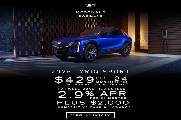 Vehicle for illustration purposes only. 2.9% APR for 60 months for well-qualified buyers when financed w/Cadillac Financial. Monthly payment is $17.92 for every $1000 you finance. Average down payment is 13.2%. Some customers will not qualify. **For Current Owners and Lessees of 2012 model year or newer Acura, Audi, BMW, Ford, Honda, Hyundai, Infiniti, Jeep, Kia, Lexus, Lincoln, Mercedes-Benz, Toyota, Volvo, Porsche, Tesla, Genesis, Polestar and Rivian vehicles : Each dealer sets own price. $429/month for 24 months. Your payments may vary. Payments are for a 2026 CADILLAC LYRIQ AWD Luxury w/AWD with an MSRP of $64,495. Based on due at signing amount of $5,979 (after all offers). 24 monthly payments total $11,016. Must show proof of ownership/lease. Option to purchase at lease end for an amount to be determined at lease signing. Lessor must approve lease. Take new retail delivery by 03-31-2026.